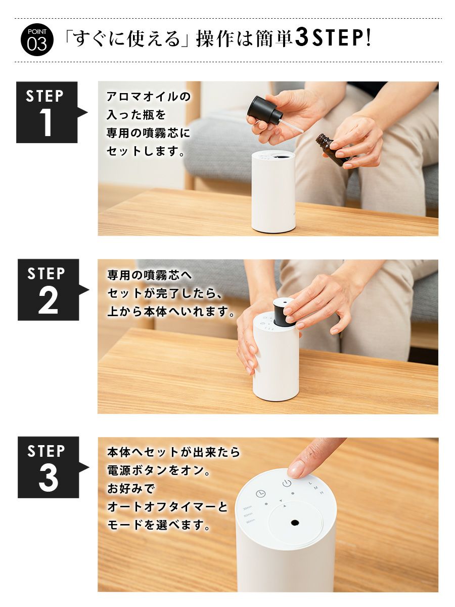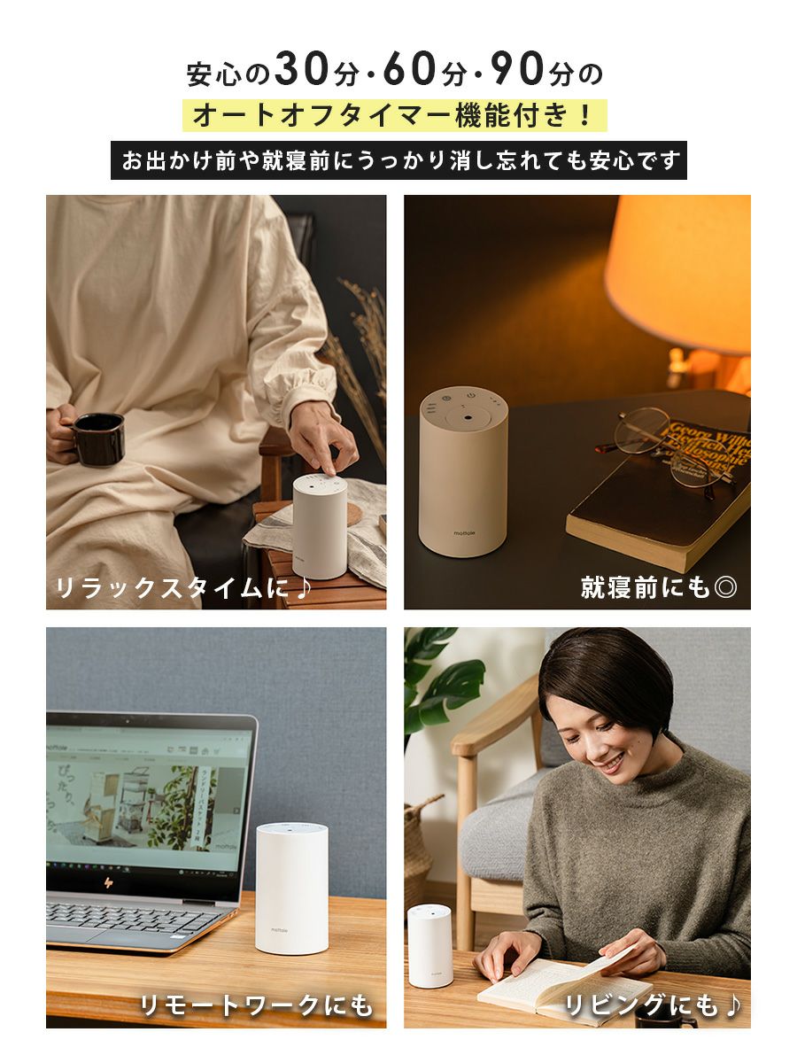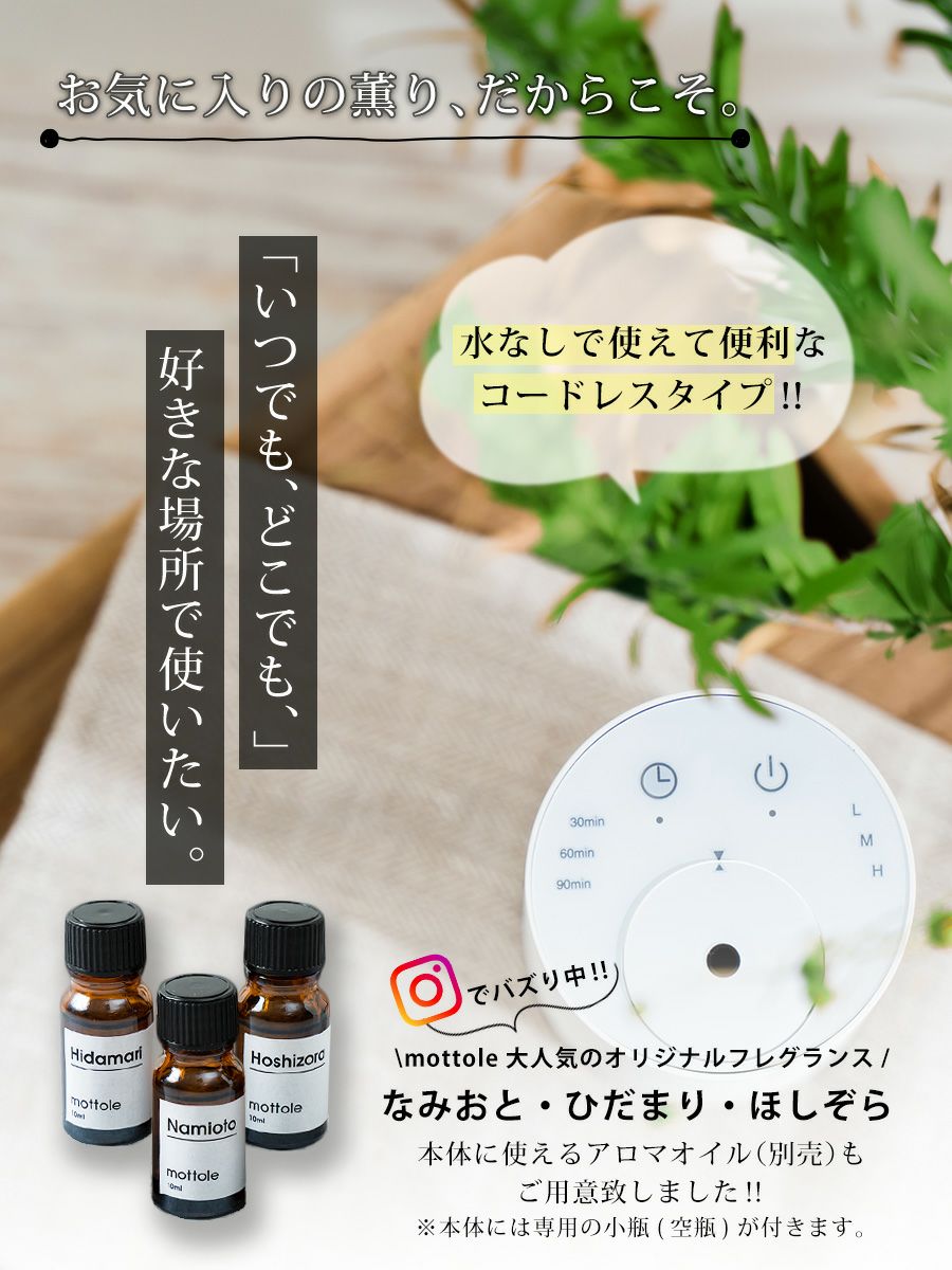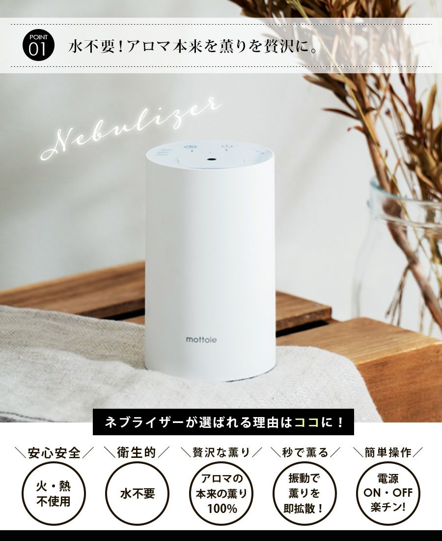 | アロマディフューザーは水の入れ替えが面倒だし、 好きな場所で使えない…リードディフューザーは 中身が無くなるまで変えられない… すぐに薫りが広がってお手入れもカンタンなものがいいな。 考えるとこんなアロマネブライザーができました。 |