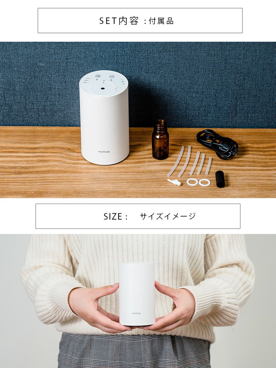 | 本体(ボトル10ml用装着済)、USBコード、噴霧芯、パッキン x 2、チューブ、噴霧芯交換用ツール、取扱説明書(保証書付) |