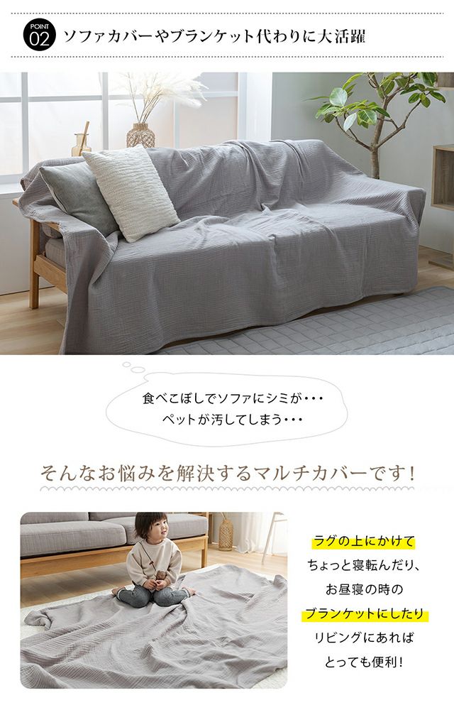 パサッと一枚敷くだけで、寝室やリビングで役立つマルチカバー。
