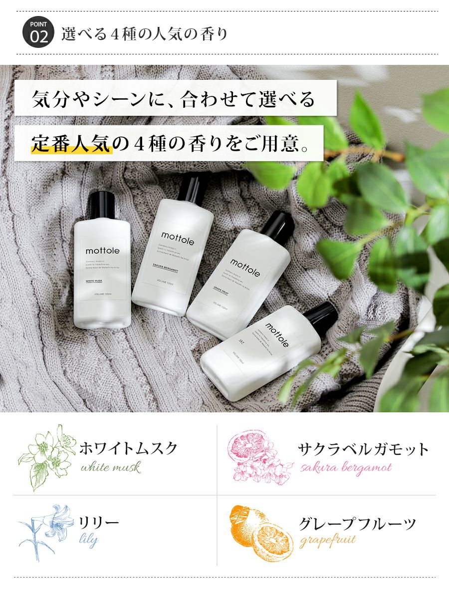 他の画像を見る ホワイトムスク グレープフルーツ サクラベルガモット リリー MTL-A013 アロマウォーター 4種の香りアソートセット ¥ 1,440 税込 在庫切れ 詳細を見る お気に入りに登録する